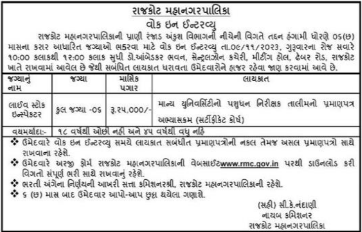 Rajkot Municipal Corporation (RMC) Recruitment 2023 : Rajkot Municipal Corporation (RMC Recruitment 2023) has published an Advertisement for the Live Stock Inspector Posts. Eligible Candidates are advised to refer to the official advertisement and apply for this post. You can find other details like age limit, educational qualification, selection process, application fee, and how to apply are given below.